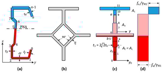 Cross-section subdivision parts. (a) Open cross-section with extra node (5) and plastic neutral axis, PNA; (b) cross-section with inclined parts and diamond shape; (c) compressed cross-section equivalent to (b), where thickness of inclined parts is measured horizontally; (d) stresses where parts 6 to 9 give the axial force and 1 to 5 (At, red area in tension) and 6 to 11 (Ac blue area in compression) give the moment. is characteristic value of 0.2% proof strength. = 1.1 in [].