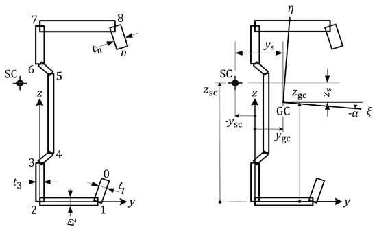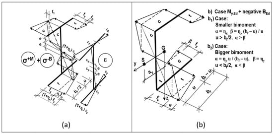 Table 13a,b, Table 14a,b and Table 15a,b contain formulae of all cross-sectional properties for (a) monosymmetric I-shaped sections, (b) channels, and (c) Z-sections, including relevant concomitant internal forces. The calculation of the approximate values is based on the midline model with thicknesses, taking into account (a) + (d) details of element connections (Figure 4). The formulae are presented in both (a) dimensionless form, enabling parametrical studies, and (b) formulae for direct design. They are proposed for educational purposes and the quick design of structures in practice as well. Wpl values relate to the fibers located in the midline, not to the surface of the section.