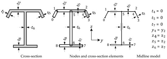 As the elements are given with the midline dimension and the thicknesses, some errors may occur in the corners depending on how the corners are modeled. If they are modeled with one node, then there will be some overlapping of the area (red) and missing area (white), according to Figure 4a. The cross-section area will always be correct, but there will be a small error in Iy, Iz , and so on, because the area t/2 × t/2 (red in Figure 4a) will have a small error in the distance to the coordinate axis. This error is usually negligible in corners, but in sections with branches, the error may be notable, as the area is doubled in the overlapping area (red in Figure 4d). These errors can be overcome if the corners are modeled with two nodes, according to Figure 4b,c, with an element with a thickness of 0 between them.