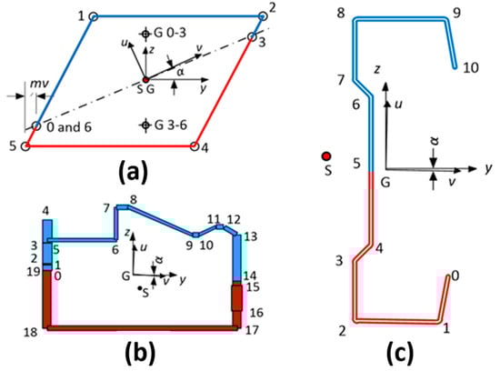 The Eurocode EN 1999-1-1:2007 [] in the informative Annexes C and J, respectively, provides formulae for the calculation of (a) cross-section constants for thin-walled open cross-sections (C.1, J.1), (b) cross-section constants for open cross-sections with branches (C.2, J.2), and (c) a torsion constant and shear center of cross-sections with closed parts (C3, J.3). In EN 1999-1-1:2023 [] contained in the informative Annex G, the same formulae as in the 2007 edition are included [], as well as the formulae for the calculation of the shear area (G.9) [], plastic section modulus, and the interaction formula.