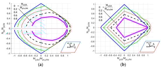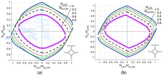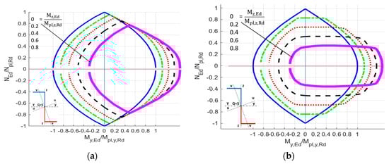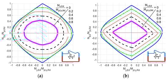 Altogether, 15 interaction diagrams present results valid for various shapes of cross-sections under combinations of three internal forces, namely NEd + My,Ed + Mz,Ed or My,Ed + BEd + Mz,Ed. They are a product of own freeware, which can be found in the blog https://antonioagueroramonllin.blogs.upv.es/ (accessed on 15 November 2024).
