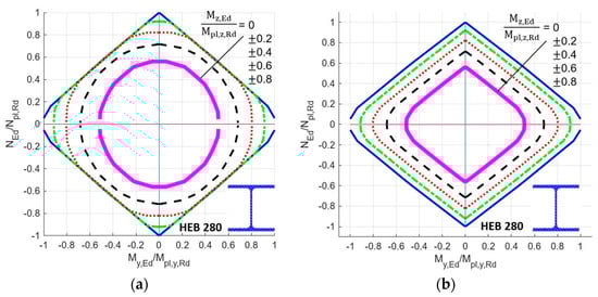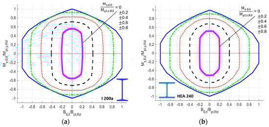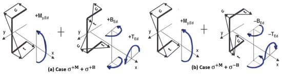 It is interesting to show (i) the value BEd,conc associated (concomitant) with the maximum bending moment Mpl,y,Rd,max and (ii) the value MEd,conc associated (concomitant) with the maximum bimoment Bpl,Rd,max > Bpl,Rd. See the diagram for the plastic resistance without strengthening in Figure 24. Both computer programs DUENQ [] and QST-TSV-3Blech [] gave very similar values, which are presented in Table 12.