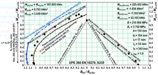 The obtained results and comparisons of analytical [] and computer results [] are presented in graphical form in Figure 24. The comparisons of these results show acceptable agreements. For negative bimoment (b) case in Figure 20 and Figure 21), the final result is the simple interaction formula (63) derived by Baláž []. Formula (63) is limited to My,Ed ≤ Mpl,y,Rd, being on the safe side. The solid line on the right end is compared with “full black circles” obtained by the computer program [] (see Figure 24). For the a) case (positive BEd, Figure 21), only the results of the computer program [] are shown.