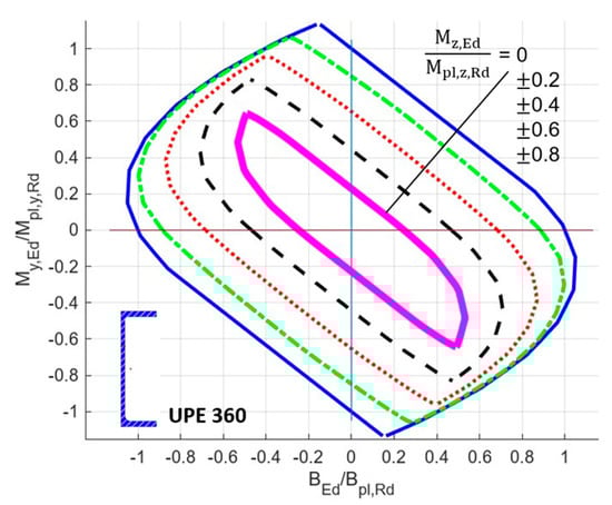 UPE 360 section. Interaction diagrams of My,Ed + Mz,Ed + BEd. For midline model: Npl, Rd = 1798 kN, Mpl,y,Rd = 197.80 kNm, Mpl,z,Rd = 44.24 kNm, Bpl,Rd = 6.795 kNm2, Mpl,y,Rd,max = 225.45 kNm with BEd,conc = −1.0357 kNm2, Bpl,Rd,max = −7.3304 kNm2 with My,Ed,conc = 47.31 kNm. We can compare these values with the results in Table 12.