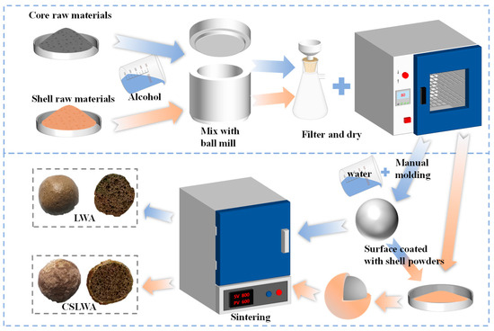 - Shang, X.; Li, J. Manufacturing and performance of environment-friendly lightweight aggregates with core-shell structure. J. Clean. Prod. 2020, 276, 123157. [Google Scholar] [CrossRef]