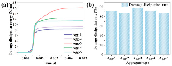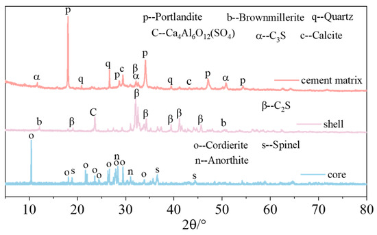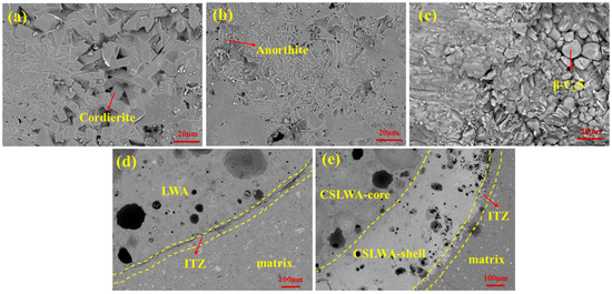 - The core strength of CSLWA affected the failure behavior of CSLWAC. When the strength of CSLWA is lower than the cement mortar, increasing the core strength of CSLWA can improve the toughness of concrete; when the core strength of CSLWA is higher than the cement mortar, further increasing the core strength is not conducive to energy dissipation, which is detrimental to the toughness of concrete. The optimum core strength of CALWA is the strength of the cement mortar, which helps to increase the energy dissipation and lowers the energy generated during CSLWA failure, beneficial for improving the brittleness of lightweight aggregate concrete. Therefore, a suitable composition of 6:4 was proposed for the “cordierite–anorthite” core constitution.