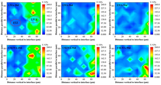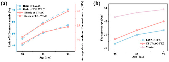 - Experimental results showed that the active belite shell of CSLWAC significantly improved the mechanical characteristics of the ITZ as the hydration age increased. Specifically, the ITZ elastic modulus of CSLWAC was higher than that of LWAC at 28 d, 56 d, and 90 d, with improvements of 6.1%, 8.1%, and 12.3%, respectively. Additionally, the fracture energy increased by 10.0%, 8.3%, and 15.3%, respectively;
