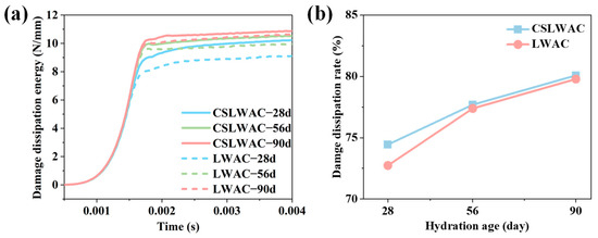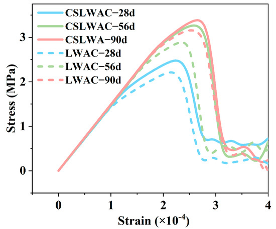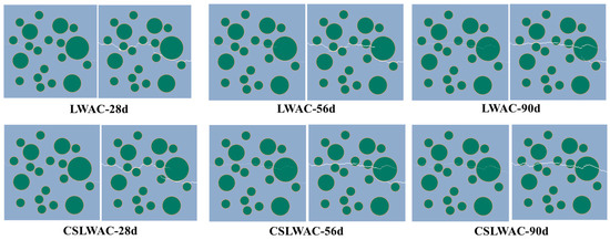 - Compared with LWAC, the improved toughness of CSLWAC is due to the crack extension mode. At 28 d and 56 d, the cracks of CSLWAC sprouted from the ITZ, mortar, and aggregate core, and the crack extension pathway was more than that of LWAC. At 90 d, although the strength of CSLWAC continued to improve, the crack extension mode changed to penetration crack damage. In conclusion, CSLWAC showed higher yield stress, yield strain, and damage dissipation energy compared to LWAC, which effectively improved the brittleness properties of LWAC;