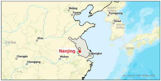 The location of the city of Nanjing in eastern China.