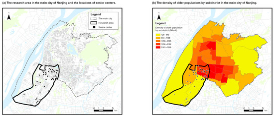 The research area in the main city of Nanjing (a) and the density of older populations by subdistrict (b).