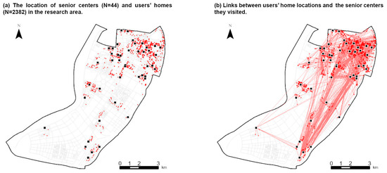 The geo-referenced check-in data of senior centers, including locations of senior centers and users’ homes (a) and check-in records (b). Senior centers are marked as black squares, and users are marked as red dots. Red lines indicate which user visited which senior center.