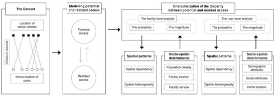 We firstly generate models of older adults’ potential and realized access based on the geo-referenced check-in data. Then, the disparities between potential and realized access are characterized by probability and magnitude at both user and facility levels, aiming to answer the question of to what extent older adults’ realized access deviates from potential access. For both levels, the spatial patterns and socio-spatial determinants of the disparities are analyzed, respectively, to examine whether realized access exhibits certain spatial patterns and what factors may influence older adults’ realized access. Based on the framework, we hope to achieve a comprehensive understanding of older adults’ access to community-based services.