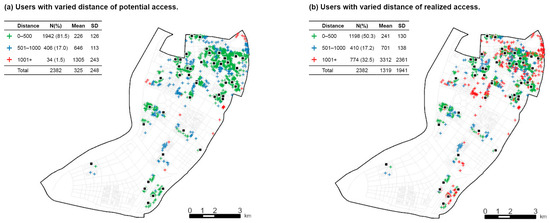 As for the spatial distribution of users, it can be seen that compared to the potential access calculations, a large number of users who traveled more than 1000 m emerge in reality. Moreover, long-distance users in reality are clustered in certain areas, such as the red marks in the top-right corner and in the middle of Figure 5b. The clustering of users indicates the spatial heterogeneity of patterns of realized access. Moreover, considering Figure 5a,b, it seems that long-distance users in reality are likely to be those that were designated as medium-distance users in the potential access calculations, i.e., those who live 500 m away from their nearest centers. This spatial pattern seems to suggest that when older adults live far away from senior centers, they are less likely to visit their nearest centers, but rather more distant ones. Nevertheless, this will be further illustrated in the following sections.