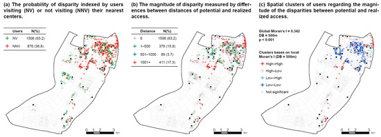 The spatial variance of the magnitude of the disparity is presented in Figure 6b,c. Figure 6c presents the result of the tests of global and local spatial autocorrelation with a distance band of 500 m. The statistic of Global Moran’s I () indicates that older adults with a similar degree of magnitude are more likely to be close to each other. The results of Local Moran’s I further reveal the clusters of users. It can be seen that users with low levels of disparity are aggregated in the middle of the upper part of the map. This can be explained as older adults living in these areas have multiple senior centers available within a short distance. Even though they did not visit their nearest ones, the centers they visited are still close to their residence, thus resulting in lower degrees of disparities. In contrast, there are clusters of older adults with high degrees of disparities in the top-right corner and the middle of the map. As presented in Figure 5a, these people need to travel longer distances to their nearest centers.