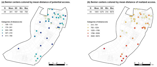 The spatial distribution of senior centers regarding mean distances of potential and realized access is presented in Figure 7. It can be seen that the two figures show distinct spatial patterns. In Figure 7a, centers with higher mean distance of potential access are mainly located in the middle part of the map where senior centers are sparse, while in Figure 7b, centers with higher mean distance of realized access are mainly located in the bottom part of the map, and are newly developed residential areas far away from the inner city. Moreover, most of the centers in the dense residential areas of the inner city (the upper part of the map) have a lower mean distance of realized access. In brief, it seems that senior centers in the outer city are more likely to accept long-distance users.
