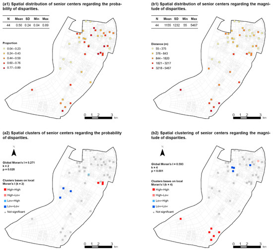 For the magnitude of disparity, the mean value among the 44 senior centers is 1155 m (see Figure 8(b1)), showing a substantial degree of disparity. A clear spatial pattern can be seen, namely, senior centers with high levels of disparity are mainly located in the outer city (the lower part of the map), while most of the centers in the inner city have low levels of disparity. The statistics of Global Moran’s I also show a strong spatial autocorrelation (), and the test of Local Moran’s I (Figure 8(b2)) identifies a high-high cluster of centers in the bottom of the map, while low-low clusters are located in the inner city in the upper part of the map.