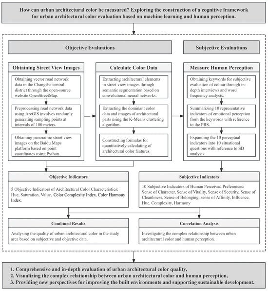 Architectural color significantly impacts the quality of built environments and is closely related to the physical and mental health of residents. Previous studies have conducted numerous valuable explorations in this field; however, the challenge of quantitatively measuring the characteristics of architectural colors in depth and examining the complex relationship between these colors and human perception remains an unresolved issue. To this end, this study builds upon recent advancements in data technology and emotion analysis to develop a comprehensive cognitive framework for urban architectural color evaluation. It combines machine learning techniques and perception scales, utilizing both objective and subjective data. By acquiring and recognizing numerous street-view images of the Changsha Central District, we quantitatively examined the hue, saturation, value, color complexity index and color harmony index of urban architectural colors and investigated the complex relationships between human perception and architectural colors through large-scale participant ratings and correlation analyses. The results show that the architectural colors of the study area are warm, with low saturation and moderate value. Most areas exhibit a high color complexity index, whereas the overall color harmony score is low. Human-perception evaluations indicate that people are generally satisfied with the urban architectural colors of the Changsha Central District. For further optimization, the saturation and color harmony scores need to be enhanced. This study provides a comprehensive evaluation of urban architectural color quality, visualizing the complex relationship between urban architectural color and human perception. It offers new perspectives for improving the built environments and supporting sustainable development, with practical application value.