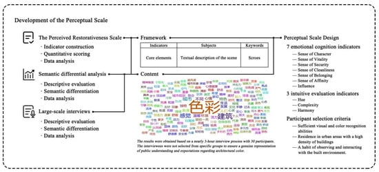The perception scale is developed based on the PRS scale and SD analysis, following this process: Firstly, we randomly selected 30 participants from both online and offline sources, conducting nearly 3 h of interviews in total. These interviews covered topics such as emotions, activities, and events related to urban architectural colors. Participants were not chosen from specific demographic groups to ensure a more accurate representation of public perceptions. Subsequently, we conducted a word frequency analysis of the interview content to comprehensively classify and summarize the impact of architectural color on human perception. Specifically, the public’s emotional perception of architectural colors includes 7 indicators: Sense of Character, Sense of Vitality, Sense of Security, Sense of Cleanliness, Sense of Belonging, Sense of Affinity, Influence. Intuitive evaluation includes 3 indicators: hue, complexity, harmony. Finally, we expanded the 10 indicators into 10 descriptive questions that provide context, pre-set answer options and corresponding scores. Each criterion was evaluated on a five-point scale with a possible maximum score of 50 points, allowing participants to make the most accurate choices when presented with random street view images (Figure 4, Table 2).