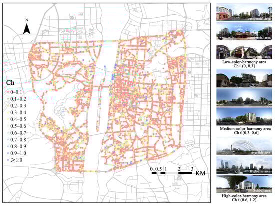 The results were visualized using ArcGIS, as shown in Figure 9, wherein points exhibiting a lower color harmony score are densely clustered and dispersed throughout multiple areas within the Changsha Central District. Additionally, those exhibiting a higher color harmony score are scattered across various locations, primarily plazas, schools, high-rise areas, transportation routes, and riverside landscapes. Therefore, the urban architectural color scheme of the Changsha Central District lacks harmony, leading to a visually chaotic appearance, and only a few regions subjected to formal planning exhibit a satisfactory degree of color coordination.