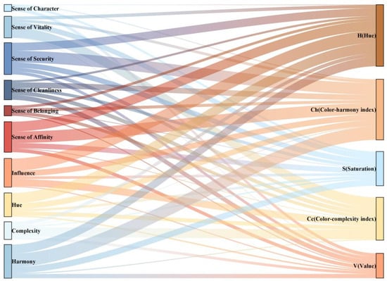 The results indicate an average total score of 30.86 across all scales, with 66.67% of the images exhibiting a cumulative score of ≥30. The average score for images predominantly featuring warm colors was 32.30, whereas that for those predominantly showing cool colors was 28.83. Among the scales with total scores of ≥30, the average saturation data (0.13) were higher than the overall mean saturation data (0.09) for architecture within the study area. Additionally, the mean value (0.50) was the same as the overall mean value (0.50). The difference between the average color complexity score (0.65) and the general mean (0.62) was minimal, whereas the average color harmony score was 0.33, surpassing the overall mean of 0.20. Additionally, seven of the ten evaluative indicators exhibited a stronger correlation with at least one of the color feature datasets, one exhibited an insignificant correlation, and two exhibited low correlations.