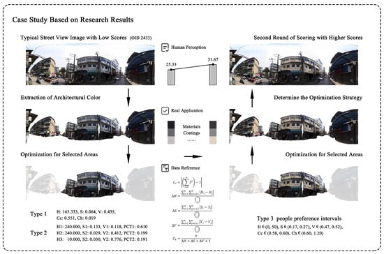 As a data-driven approach, our study demonstrates its generalizability and utility through the following case (Figure 12). We selected a street view image with low participant scores, a traditional neighborhood in the Changsha Central District. The goal is to enhance the quality of the built environment by altering the architectural color in the central section of the image. Firstly, the following two types of color data for the image were backtracked: the HSV data, color complexity index, and color harmony index of the entire image; and the HSV data of the three dominant colors in the image along with their respective percentages. Subsequently, referring to Equations (1) and (5), and the people preference intervals for Cc and Ch data summarized in Section 3.3, the appropriate direction for adjusting the HSV data of the entire image can be obtained. Finally, we modified the current color in Photoshop and conducted a second round of scoring on the image, with the same three participants scoring significantly higher. In practice, after calculating the numerical optimization directions for the five indicators, relevant building materials or coatings can be selected for design based on their characteristics. This suggests that the cognitive framework for urban architectural color evaluation provided according to this study can be effectively utilized in the fields of architectural and urban design. Additionally, although this case primarily focuses on the optimization and renovation of existing architecture, its principles are also applicable to the comprehensive planning of new constructions.