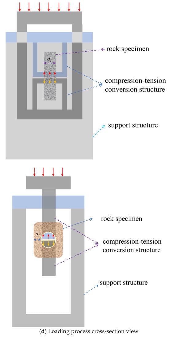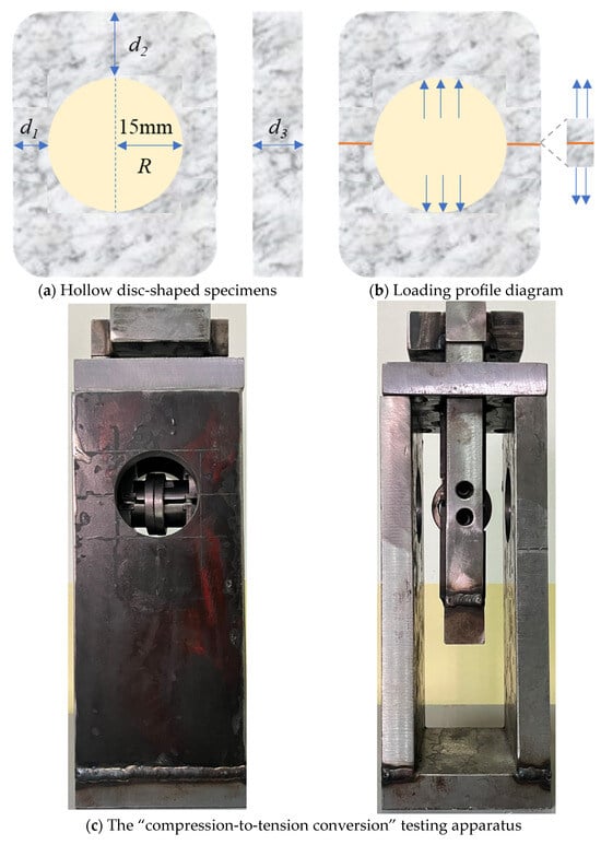 Rock specimens used for direct tensile testing were fabricated in hollow disc-shaped samples with a certain thickness (see Figure 1a, in which d2 > d1). During the experiment, these specimens were placed in a customized compression-to-tension conversion apparatus (see Figure 1c) comprising two main parts: a support structure and a compression-to-tension conversion structure. The strength of the steel used to make the equipment was much greater than the tensile strength of the rock, so there was no deformation of the steel during the test. The equipment was then placed on a material compression-testing machine to apply a compressive load to the upper portion. The load acting on the rock specimen was the direct tensile load, which was equal to the applied compressive load [40,41]. Thus, this method enabled a compression-to-tension conversion testing approach. The test loading diagram is shown in Figure 1d,e.