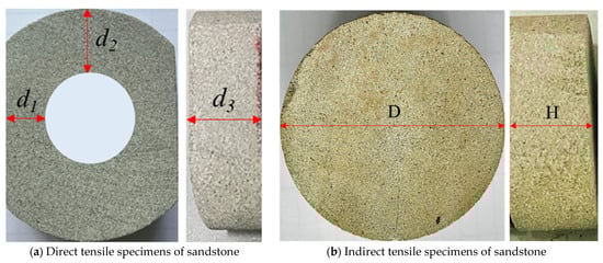 The method just described is theoretically straightforward and feasible. Similarly, it was not difficult to machine rock specimens into the shape depicted in Figure 1a. The rock sample must only be drilled along the central axis of the standard specimen using a hollow drill bit with a diameter of 30 mm (Xi’an University of Technology, Xi’an, China). The prepared standard rock samples were placed in the compression-to-tension instrument for the experiment, and the device was placed on the material compression-testing machine to record test data on the computer. The direct tensile test not only considered the three major rock types, metamorphic, sedimentary, and magmatic, but also took into account the influence of the particle size of rock composition, represented by shale, sandstone (medium- to fine-grained sandstone), mudstone sandstone, porphyrite, and quartz schist. The indirect tensile test (Brazilian splitting test) was used as the control group’s testing method, aimed at providing a more robust demonstration of the proposed direct tensile test method. The indirect tensile test specimen had a thickness of 25 mm and a diameter of 50 mm. Taking the sandstone specimens as an example, the processed specimens are shown in Figure 2a,b.