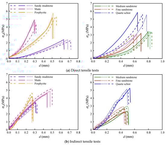 Figure 3b shows that the stress–displacement curves of the six types of rock specimens underwent three stages in the indirect tensile test: compaction, linear elasticity, and failure. The failure stage, in particular, appears as a vertical line. This indicates that all specimens instantly failed upon reaching their peak tensile stress, demonstrating significant brittle failure characteristics [42]. Figure 3a shows that the stress–displacement relationship curve also underwent three stages in the direct tensile test. The difference is that when the tensile stress was low, the first stage was the initial crack inside the specimen, followed by linear elasticity and the failure reduction stage.
