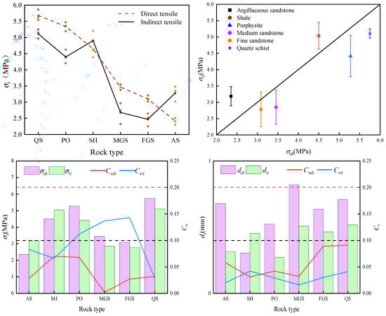The tensile strengths of six kinds of rocks in two kinds of tensile tests are shown in Figure 4. The statistical results of tensile test data and the references for variability are shown in Table 1 and Table 2, respectively. The tensile strength distributions of the six types of rock specimens obtained using the two tensile test methods were the same. The tensile strength of a rock is closely related to its lithology (mineral composition, structure, and fracture). The higher the quartz content is, the greater the tensile strength is. The structural characteristics of a rock affects its tensile strength [48,50,51] such that rocks with finer crystals and ordered arrangement are usually stronger. Cracks, fractures, and other structural defects in a rock also affect its tensile strength. The presence of cracks may cause the rock to break more easily under stress. Shale has an obvious bedding structure, and the experimental values for it fluctuate. The tensile strength of quartz schist is the highest and that of argillaceous sandstone is the lowest.