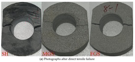 Rock specimens after failure in the direct and indirect tensile tests are presented in Figure 5. The direct tensile tests in this study showed that while the locations of fracture surfaces on the rock specimens differed (see Figure 5a), these fractures all occurred in the middle of the rock’s tensile zone. This indicates that these failures occurred in the pure tensile region. In the indirect tensile test specimens, the failure passed through approximately the middle of the disc along the loading contact (see Figure 5b). It can be seen that the roughness of the fracture sections in the three types of rock specimens differed by examining the cross-section morphology of the specimens after failure. The fracture section of medium sandstone was the roughest, followed by fine sandstone, and the shale was relatively flat. This observation suggests that there is a strong link between the roughness of fracture surfaces in rock and the size of the mineral particles. Rocks with larger mineral particles are more likely to develop cracks and fractures due to the way these larger grains contribute to the formation of rough fracture surfaces.