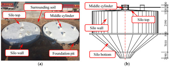 The technology for constructing reinforced concrete silos above the ground level is relatively mature; for example, China already has corresponding design specifications [10]. The mechanical properties of underground RC grain silos have recently attracted the attention of several studies. Chen et al. [11] studied the temperature field in underground RC grain silos based on the computational fluid dynamics numerical simulation method, and the overall trend of temperature changes and the influence of silo geometric dimensions on the temperature field were analyzed. Xiong et al. [12] investigated the load-bearing capacity of underground silo walls based on the cylindrical shell model analysis method and the finite element (FE) method, and the distribution of vertical bending moment and circumferential force on the silo wall were analyzed. Xiong et al. [13] performed lateral pressure monitoring tests on underground silo walls; calculated the Rankine static, active, and passive soil pressures on the walls; determined the calculation method for soil pressure on the silo wall; and studied the distribution of vertical bending moments and circumferential forces on the silo wall. Chen et al. [14] adopted the Monte Carlo stochastic FE method to investigate the reliability of underground RC grain silos, as well as the sensitivity of random parameters to performance functions. Liu et al. [15,16] conducted a scaled test on the anti-floating performance of underground RC grain silos, tested the displacement and constraint reaction of the scaled model of an underground silo, and analyzed the buoyancy and friction of the silo wall. Chen et al. [17] provided a method for calculating the deformation and internal forces of the underground silo wall through the moment theory of cylindrical shell and revealed the deformation characteristics and internal force distributions of the silo wall. Jin et al. [18] investigated the mechanical properties of the silo wall through stress monitoring tests and numerical simulations on underground RC grain silos. Chuai et al. [19] conducted bending and compressive tests on full-scale steel plate concrete composite wall specimens, investigated the mechanical properties of vertical joints in steel plate concrete composite walls of the prefabricated underground silo and compared the mechanical properties of seamed and seamless specimens. Zhang et al. conducted relevant research on the design of plastic concrete walls for underground grain silos, including studying the waterproof performance and mechanical properties of plastic concrete silo walls under the combined action of bending moment and water pressure through experimental investigation and numerical simulation [20]; hydraulic tests and numerical simulations were conducted on plastic–concrete specimens with different waterproof PP plate thicknesses to explore the water pressure bearing capacity, failure mode, and force of plastic–concrete specimens [21]; the performance of a novel composite structure, a polypropylene–concrete wall, for underground silos was investigated experimentally, and a new modified method was proposed to predict the bending moment at the mid-span cross-section [22]. The above research mostly focuses on the mechanical properties of underground RC grain silo components during service, however, there are few findings on the mechanical properties of underground RC grain silos during backfilling construction.