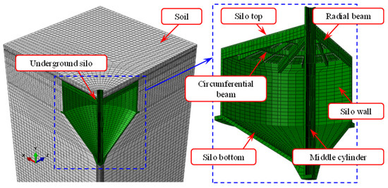 The solid element C3D8R in ABAQUS was used to mesh the silo top, silo wall, silo bottom, middle cylinder, and surrounding soil. This element type is an 8-node solid element with reduced-integration stiffness, which can be used for nonlinear analysis such as contact, large deformation, plasticity, and failure. The overall mesh size of the underground silo and the surrounding soil was 0.5 m and 1 m, respectively, while the connection of each component adopted a refined mesh size to obtain more accurate results. Figure 2 depicts the FE meshes of the underground RC grain silo and the surrounding soil.
