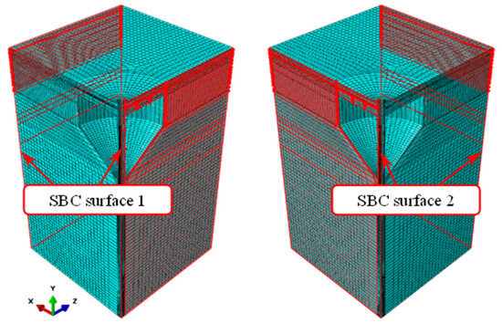 The boundary conditions are critical for FE analysis. Since the quarter model of the underground RC grain silo and the surrounding soil was established, the symmetric boundary condition (SBC) was applied to the surface at the symmetric plane of the FE model. The boundary conditions are shown in Figure 3. The x-axis SBC was applied to Surface 1, for which the Translational displacement U1 and the Rotational displacements R2 and R3 of all the nodes on Surface 1 were limited. Similarly, the z-axis SBC was applied to Surface 2, for which the Translational displacement U2 and the Rotational displacements R1 and R3 of all the nodes on Surface 2 were suppressed. All DOFs of the bottom surface of the soil were constrained.