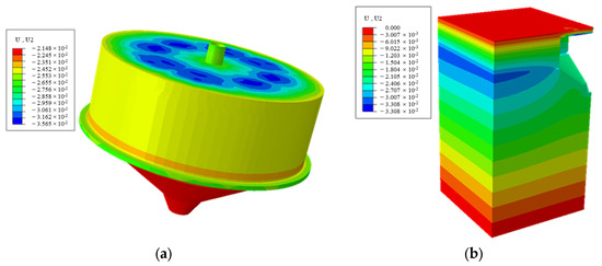 Figure 4 depicts the vertical displacement contours of the underground RC grain silo and the surrounding soil after the completion of backfilling construction. As shown in Figure 4a, the underground silo suffers a total settlement of 0.021 m because of self-weight and the above soil load during the backfilling construction processes. The maximum vertical displacement of the silo is located at the mid-span cross-section of the radial primary beam at the silo top. The maximum displacement includes the overall settlement of the underground silo and the deflection of the silo top under the action of self-weight and above soil load. It can be observed from Figure 4b that backfilling construction will induce the settlement of the surrounding soil. After the completion of backfilling construction, the maximum vertical displacement of the soil around the silo is 0.036 m, which is located above the mid-span cross-section of the radial primary beam. Additionally, a relatively large settlement occurs at the bottom cross-section of the silo wall (−10.26 m), and the maximum vertical displacement of this section is 0.032 m.