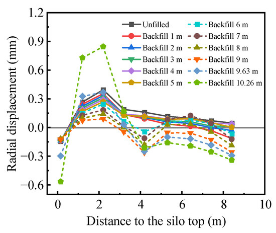 The largest radial displacement variation in the underground silo wall during the backfilling construction process is presented in Figure 6. During the backfilling construction process, the maximum radial displacement of the silo wall first decreases and then increases. This is because, during the backfilling construction of the soil on the side of the warehouse wall, the lateral pressure on the warehouse wall will reduce the radial displacement of the warehouse wall. However, during the backfilling construction of the soil on the upper part of the warehouse top, the soil will cause a large bending moment on the structure of the warehouse top beam and slab, and the warehouse top beam and slab will solidify with the warehouse wall. Therefore, the bending moment caused by the soil on the warehouse top will be transmitted to the warehouse wall, resulting in an increase in the displacement of the warehouse wall. The maximum radial displacement of the silo wall decreases from 0.39 mm to 0.09 mm during the soil backfilling construction around the silo wall but increases to 0.84 mm after the completion of soil backfilling construction above the silo top. The maximum radial displacement of the silo wall increases by 114.5% over the entire backfilling construction. The existing research indicates that the limit value of radial displacement of the grain silo wall is 12 mm [25]. Accordingly, the radial displacement of the underground silo wall is significantly smaller than the limit value.