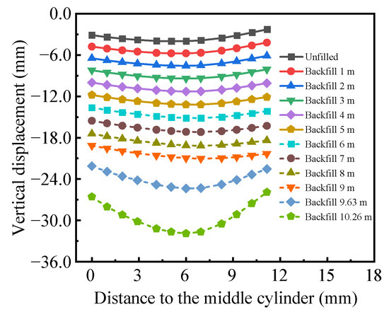 Figure 7 plots the vertical displacement of the radial primary beam at the underground silo top during the backfilling construction process. The vertical displacement of all nodes of the radial primary beam increases as the thickness of the backfill soil increases. This is because the overall settlement of the underground silo increases as the soil back-filling progresses. Before the backfilling construction, the vertical displacements of the middle cylinder end, silo wall end, and mid-span cross-section of the radial primary beam are 3.11 mm, 2.28 mm, and 3.98 mm, respectively. When the backfill soil thickness reaches 9 m, these vertical displacements increase significantly to 19.15 mm, 20.33 mm, and 20.96 mm, respectively. After the completion of backfilling construction, these vertical displacements further increase to 26.57 mm, 25.90 mm, and 31.90 mm, respectively.