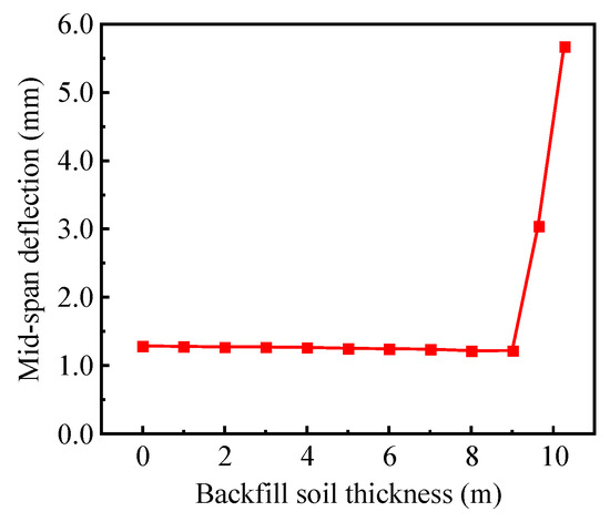 The mid-span deflection of the radial primary beam at the silo top during the backfilling construction process is shown in Figure 8. The mid-span deflection of the radial primary beam remains almost constant during the back-filling construction of the soil around the silo wall, whereas the mid-span deflection significantly increases during the last two steps of the backfilling construction. Before the backfilling construction, the mid-span deflection of the radial primary beam is 1.29 mm. When the backfill soil thickness reaches 9 m, the mid-span deflection of the radial primary beam is observed to be 1.22 mm. After the completion of backfilling construction, the mid-span deflection increases to 5.67 mm. Compared with before the backfilling construction, the mid-span deflection of the radial primary beam increases by 3.4 times after the completion of backfilling construction. This is because, before the backfilling of the soil above the silo top, the radial primary beam deflection is mainly caused by the self-weight. Nevertheless, after the completion of backfilling construction, the radial primary beam deflection is mainly caused by the combined action of the self-weight and the above soil load. According to the current design code, when the beam span L0 is greater than 9 m, the deflection limit value of the beam is L0/300. Hence, the deflection limit value is 39.2 mm for the radial primary beam, and the maximum deflection of the radial primary beam does not exceed the limit value, which fits the requirements of the current design code.