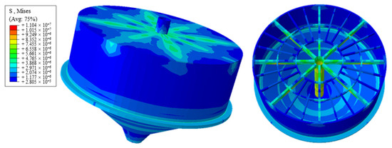 Figure 9 displays the von Mises stress contours of the underground RC grain silo after the completion of backfilling construction. It can be observed that the overall mechanical performance of the underground silo is well. When the backfilling construction is completed, the von Mises stresses of the silo wall, silo top, and silo bottom are small, whereas stress concentration occurs at the connection of the silo wall and the radial primary beam, as well as the connection of the silo top and the radial primary beam. The maximum von Mises stress is located at the bottom of the mid-span cross-section of the radial primary beam, which is 11.04 MPa. This is because the bottom of the mid-span cross-section of the radial primary beam experiences high tensile stress under the action of self-weight and above soil load.