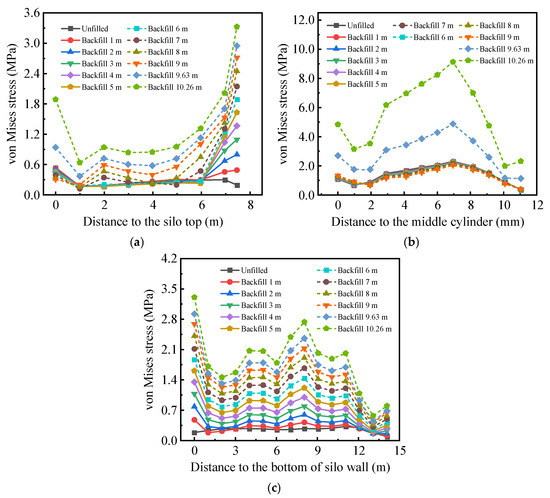 Figure 10 illustrates the variation in von Mises stresses in the underground silo during the backfilling construction process. From the results presented in Figure 10a, the von Mises stress on the silo wall decreases first and then increases from top to bottom. The stress at the connection between the silo wall and the radial primary beam is complex, which leads to stress concentration. The von Mises stress at the bottom of the silo wall is higher, and the von Mises stress of the silo wall decreases gradually from the bottom to 1 m away from the silo top. The von Mises stress at the bottom of the silo wall increases as the thickness of the backfill soil increases. It can be seen from Figure 10b that the maximal von Mises stress of the radial primary beam is relatively high. The von Mises stress reduces initially; then it increases before decreasing again as the distance from the middle cylinder increases along the length direction of the radial primary beam. The maximum von Mises stress is distributed at the radial primary beam bottom of the cross-section connected with the circumferential primary beam, which is about 7 m away from the middle cylinder. The backfilling construction of the soil around the silo wall has little effect on the von Mises stress of the radial primary beam. During the backfilling construction of the soil above the silo top, the von Mises stress of the radial primary beam increases significantly. As shown in Figure 10c, the von Mises stress distribution at the silo bottom is complicated, but the overall stress distribution of the inverted conical shell RC structure is even, without significant stress concentration. Before backfilling construction, the von Mises stress changes slightly along the sloping surface of the inverted conical shell. However, during the backfilling construction process, the von Mises stress gradually increases along the sloping surface of the inverted conical shell. The von Mises stress at each node along the sloping surface increases gradually with the increase in backfill soil thickness, and the von Mises stress of the silo bottom increases evenly with each soil backfilling step.