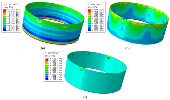 Normal stress contours of underground silo wall: (a) circumferential normal stress; (b) vertical normal stress; (c) radial normal stress.