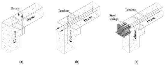 Connection types used in test specimens: (a) dowel connection; (b) post-tensioning connection; and (c) post-tensioning and springs connection.