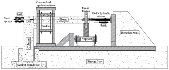 The six full-scale precast column and beam specimens described above were tested at the Structural and Earthquake Engineering Research Laboratory of Harran University. After placing the precast column into a square socket foundation constructed on the reinforced floor of the laboratory, one end of the beam specimen was rested on the short cantilever at the top of the column. The other end of the beam specimen was placed on a sliding support that allowed only horizontal movement. It is worth noting that the gaps between the column and the socket foundation were filled by placing steel plates prepared to fit perfectly in these areas, thus ensuring that the column base behaved as fixed as possible. Photographs of the test setup are shown in Figure 3, and the schematic view is depicted in Figure 4. A hydraulic actuator was connected to the system, applying cyclic loads; one end of the beam specimen was attached to the sliding support, while the other was connected to a reaction wall. A constant vertical load of 188 kN (15% of the column capacity) was applied to represent the vertical loads acting on the column specimen.