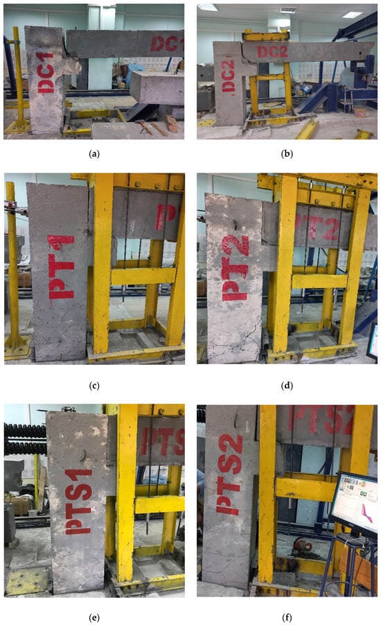 Failure modes of concrete specimens: (a) specimen DC1; (b) specimen DC2; (c) specimen PT1; (d) specimen PT2; (e) specimen PTS1; and (f) specimen PTS2.
