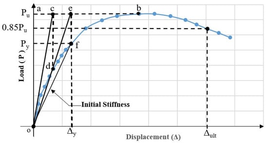 It is useful to explain how the initial stiffnesses of the samples were obtained. Skeleton curves were drawn by taking into account the maximum load value in the hysteresis curves (in the third cycle of each) for each drift ratio from the load–drift ratio graphs. Using these skeleton curves, yield load Py, the corresponding yield displacement Δy, the peak load Pu, and the corresponding displacement Δu are the calculated parameters. Yield load and the yield displacement corresponding to this load are defined in Figure 8. The calculation of these parameters is conducted by the geometro-graph method []. The calculation steps of this method are: (1) The point c, where the tangent drawn from the origin O to the skeleton curve intersects the horizontal a-b line drawn from the peak point of the curve, is determined; (2) the point d, where the vertical line drawn from the point c intersects the skeleton curve, is found; (3) the line drawn from the origin O to the point d is extended to intersect the a-b line, and the point e is determined; and (4) the load amount corresponding to the point f, where the line drawn from point e intersects the skeleton curve, is the yield load, and the displacement amount is the yield displacement. The parameters calculated from the results obtained from the experimental specimens are summarized in Table 4. Although the stiffness value explained above is called “initial stiffness” in the literature, it is actually more correct to call it “secant stiffness.” This is because, as is seen, in obtaining this parameter, the inelastic, i.e., plastic, behaviour exhibited by the element is also taken into account.