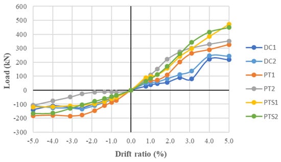 Load-displacement relationships of specimens: (a) specimen DC1; (b) specimen DC2; (c) specimen PT1; (d) specimen PT2; (e) specimen PTS1; and (f) specimen PTS2.