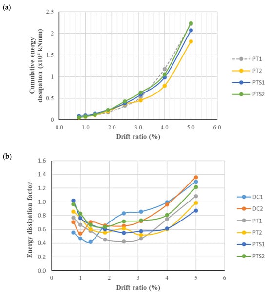 The graph showing the cumulative energy dissipation capacities of the test specimens is presented in Figure 10a. When an evaluation is formed by taking the averages of the energy dissipation capacities among the specimens (DC1-DC2, PT1-PT2, and PTS1-PTS2), it is seen that the specimens have similar energy capacities. When the average energy dissipation capacities of the DC specimens were taken as comparison values, it was determined that the average energy dissipation capacities of the PT and PTS samples were 2.85% lower and 3.65% higher than the DC samples, respectively. Therefore, it is understood that the column–beam connection types considered are not very different from each other in terms of energy absorption capacities. The columns of all the samples are identical, and the beams are also identical in terms of their dimensions and reinforced concrete reinforcement except for the types of connections to the columns. In other words, the test samples were globally sized equivalently to each other in order for the comparisons to be meaningful. Also, while determining the dimensions of the tendons in the PT samples and the tendons and springs in the PTS samples, the preservation of the mentioned equivalence was maintained with the calculations made. For all these reasons, it is not surprising that the energy dissipation capacities obtained from the hysteresis curves of the samples are close to each other. If the samples had been loaded to their limit states, of course, the effect of the difference between the column–beam connection types on the energy dissipation capacities would have been more evident.