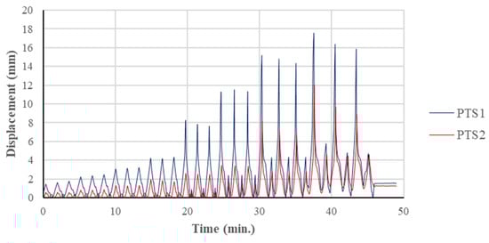 In the test setup consisting of precast columns and beams, reversible cyclic loads were applied, and the experiments were conducted using displacement control. As shown in Figure 5, the displacement-controlled loading had a cyclic nature with three equal displacement values for each loading step. This loading method is recommended in the American Concrete Institute (ACI) Committee 374 report for structural testing []. This function has been utilized by many researchers in experimental studies [,,].