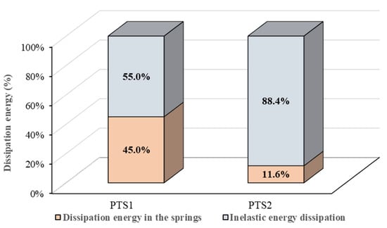 The forces generated in the springs work through the displacements they produce, dissipating energy within the springs. The amount of dissipated energy in the PTS1 and PTS2 specimens is illustrated in Figure 12. On average, 28% of the energy in the PTS specimens was dissipated through elastic deformations in the springs. This significant portion of energy dissipation through elastic deformation explains why the PTS specimens exhibited minimal damage at the column–foundation junction and remained undamaged at the column–beam connections, as described in Section 3.1. This research demonstrates that the proposed steel spring tendon system can significantly enhance the protection of column–beam connections in precast structures against dynamic loads such as earthquakes and strong winds, thereby better safeguarding the structure and its occupants and equipment.