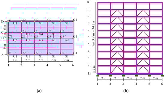 This study focuses on a typical steel building that meets the current design standards in Japan (Calculation of the Lateral Load Carrying Capacity) [,,]. The prototype is assumed to be a typical 10-story steel office building, designed with a universal layout that includes a core area in the center of the floor. The standard floor plan and the frame diagram are shown in Figure 1. The prototype uses box-type columns and H-steel beams, which are commonly used in Japan, rather than the H-type columns and H-beams typical in Europe and the United States. Additionally, the column–beam connections are assumed to follow the design standards commonly used in Japan. The prototype is a two-directional moment-resisting frame (MRF) system but with buckling-restrained braces (BRBs) arranged in the longitudinal direction at the internal frames (Elevation-B) from the first to the ninth floors. The longitudinal direction frame has five spans, and the transverse direction frame has two spans, resulting in an aspect ratio of 1.95:1. The plan dimensions were 35 m by 18 m, and the total height is 38.4 m, with a 4.2 m first story and subsequent stories each at 3.8 m. The prototype uses large hollow structural section (HSS) columns and H-section beams with thinner webs. Beam cross-sections range from H-500 × 200 × 10 × 16 to H-606 × 201 × 12 × 20 mm, while column cross-sections vary from □-400 × 400 × 16 mm to 500 × 500 × 25 mm. The foundation beams, designed to remain within elastic limits in response to the seismic behavior of the superstructure, are H-792 × 300 × 14 × 22 sections. Table 1 and Table 2 list the cross-sections and steel grades of the columns and beams. The subsequent analysis focuses solely on the longitudinal direction of the prototype building.