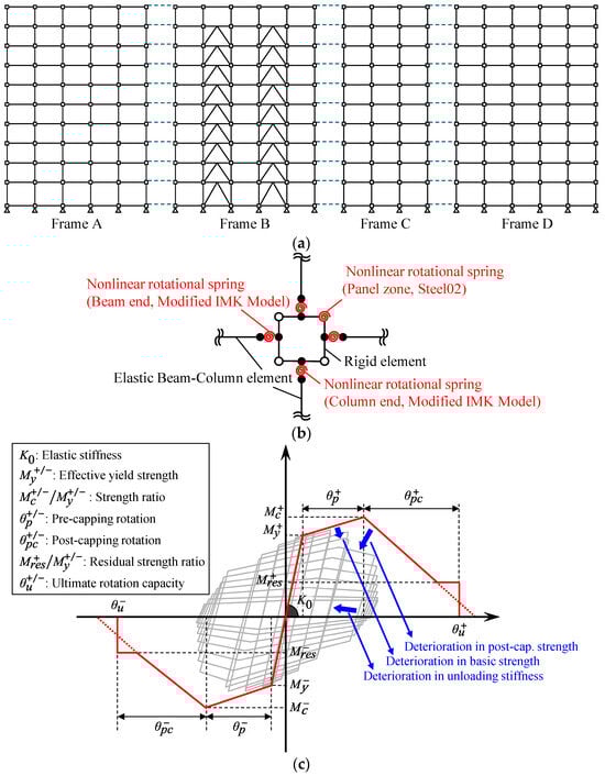 (a) Analytical model of the prototype; (b) beam-to-column connection model; (c) modified IMK model [,].